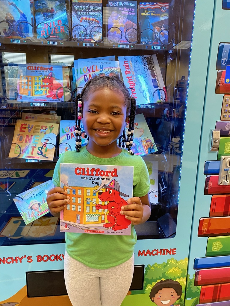 ✨📚 Meet our literacy superhero, Heiress Davis (8th coin). She just earned a gold coin from our book vending machine! 🥇🎰Heiress turned her love for reading into gold and picked out a new book to dive into! What a magical moment! 🌟💖🍭 #LiteracySuperhero #BookLovers #ReadingMagic